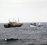 | 中国 中国渔船“浙岭渔23683”(左)正在海上拖带救助韩国渔船“渔振”号(右)(5月9日摄)。 5月9日,韩国渔船“渔振”号在中国专属经济区海域发生故障,船上主机失去动力,情况十分危险。东海区渔政局接到求救信号后,立即派出中国渔政201船,经过近6小时的全速航行,到达事发海域。5月10日,中国渔政201、浙岭渔23683船成功将韩国渔船“渔振”号和8名船员安全拖带至浙江省台州市海门港。目前,台州市海洋与渔业执法支队正积极协助联系船舶维修。 新华社发 |