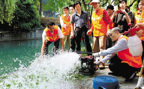 5月11日,杭州紫阳街道的11支队伍举行安全防汛抗台演练,提高应急抢险能力,迎接5月12日的“防灾减灾日”。 本报记者 梁臻 摄