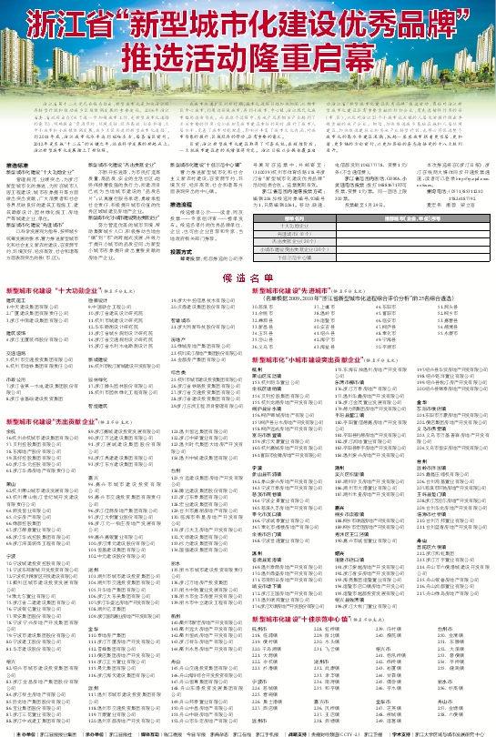 目前,浙江新型城市化建设取得了可喜成就,在辉煌背后,一大批城市建设者的成绩值得肯定。浙江日报以全媒体覆盖启动浙江省“新型城市化建设优秀品牌”推选活动,褒扬对浙江新型城市化建设具有重要贡献的标杆企业,有先进榜样作用的县(市、区),以及对浙江27个小城市试点镇的人居生活提升做出卓越贡献的地产企业。相信,加快推进城乡基础设施和人居环境建设,加快推进建筑业和房地产业转型升级,也势必将促进整个城市化的高水平建设浪潮,托起一座座城市朝着更宜居、更和谐、更幸福的方向前行,以更加昂扬的姿态迎接党的十八大胜利召开。