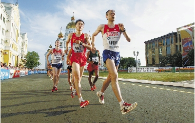 5月12日,在2012年俄罗斯萨兰斯克竞走世界杯男子20公里比赛中,王镇以1小时19分13秒的成绩夺得冠军。图为中国选手王镇(前左)在比赛中。 新华社发