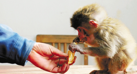 人类和动物,相互交锋又相互依存。图为饲养员正在喂小猕猴“点点”吃东西。 视野网供图