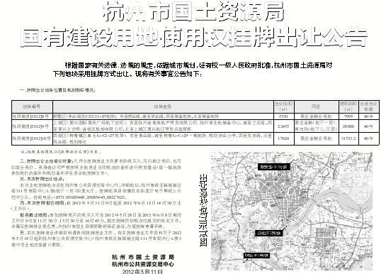 五、本次挂牌出让详细资料请参阅挂牌出让文件。有关挂牌出让文件资料可于2012年5月18日起到杭州市公共资源交易中心(杭州市钱江新城新业路311号市民中心L楼3楼)7号土地交易窗口索取。