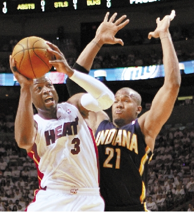 热火队球员韦德(左)突破上篮。 新华社发