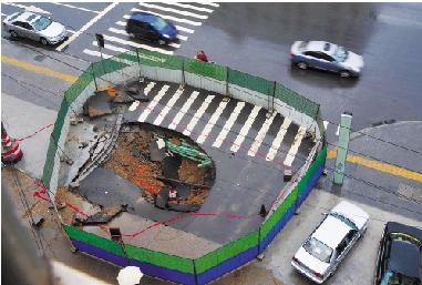 长沙市城区一处因暴雨而坍塌的路面。 新华社记者 龙弘涛 摄