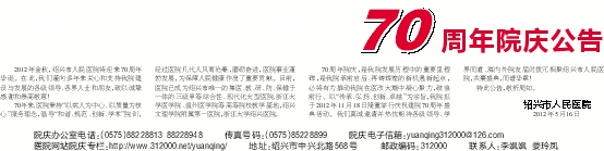 70周年院庆,是我院发展历程中的重要里程碑,是我院承前启后、再铸辉煌的新机遇新起点,必将有力推动我院在医改大潮中凝心聚力,破浪前行。以“传承、弘扬、创新、卓越”为宗旨,我院拟于2012年11月18日隆重举行庆祝建院70周年盛典活动。我们真诚邀请并热忱期待各级领导、学界同道、海内外院友届时拨冗相聚绍兴市人民医院,共襄盛典,同谱华章!