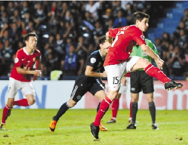 5月15日,在亚冠联赛小组赛最后一轮的比赛中,广州恒大队客场以2比1战胜泰国武里南联队,晋级亚冠联赛16强。另外一场,天津泰达队则在主场0比3负于韩国城南一和队。图为广州恒大队球员孔卡(前)在比赛中罚进制胜点球。 新华社发