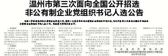 为进一步推进温州非公有制企业党建工作,建设一支高素质的非公有制企业党组织书记队伍,决定开展第三次面向全国公开招选非公有制企业党组织书记人选工作。现就有关事项公告如下:
