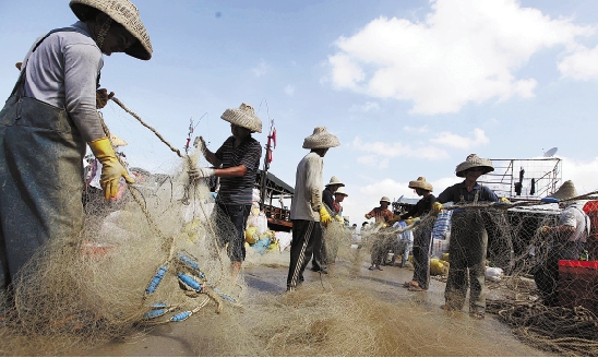 5月15日,渔民在海南省三亚市渔港码头打包渔网,做休渔准备。 新华社发
