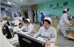 护士台上,大家各负其责,有条不紊。