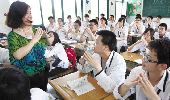 5月18日,宁波市职教中心轨道交通运营管理专业的学生跟着市聋哑学校的陆老师学手语,以便今后为聋哑乘客提供良好的服务。 胡建华 许忠亚 摄