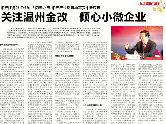 浙江可谓是招商银行行长马蔚华来得最多的省份之一。因为他对浙江众多中小企业抱有拳拳之情。用他自己的话说, 以前几乎每年都来,而且每次都要到中小企业走走看看,并与他们座谈交流。令人难忘的是,2008年国际金融危机爆发后,马蔚华第一时间来到浙江,走进困难企业,与企业共渡时艰。他提出“银行与企业是鱼和水的关系”、“救企业就是救银行”等理念,在社会各界引起了很大的反响。在招行成立25周年、服务浙江经济15周年之际,马蔚华再次来到浙江,他一如既往地关注着浙江中小企业的成长,关注着温州金融综合改革试验区,关注着银行转型与创新。
