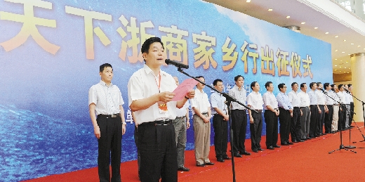 2011年8月4日,章鹏飞代表浙商在“天下浙商家乡行”活动启动授旗仪式上宣读倡议书。
