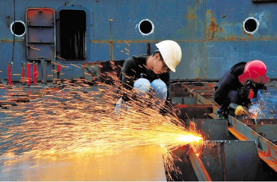 5月25日,位于海盐的浙江林龙港口有限公司,工人们在建造一艘长85米、宽22米的大船。当天,该公司有5艘新造好的大船下海试航。 邵全海 顾益民 李刚 摄