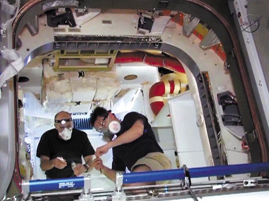 5月25日,美国太空探索技术公司发射的“龙”飞船与国际空间站成功对接,由此成为有史以来首艘造访空间站的商业飞船。这张美国航天局5月26日的电视截图显示,国际空间站上的宇航员唐·佩蒂特(左)和奥列格·科诺年科在“龙”飞船里工作。 新华社发 |