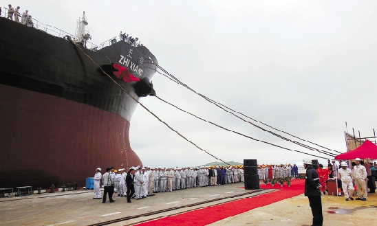 5月25日,在舟山市岱山县长涂岛金海重工股份有限公司1号码头,该公司向华融金融租赁股份有限公司交付8万吨散货轮。这是金海重工今年交付的第9艘船舶。 记者 林上军 摄