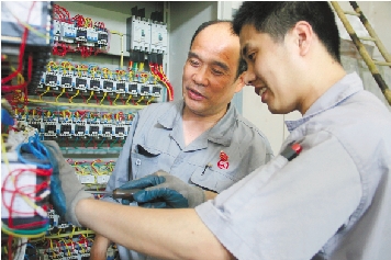 杭州福斯特光伏材料股份有限公司51岁的老党员蒋海东在机修车间内,认真指导青年技工安装配电箱,鼓励青年职工岗位成才。