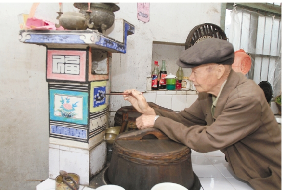 张金寿正在描画自家的灶头。吴桂潮 摄