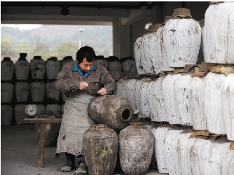 一直以来,绍兴人都以爱喝点小酒出名,尤以本地的黄酒为甚。图为工人正在修补绍兴黄酒的酒坛。 记者 梁臻 绍兴县报 高洁 摄