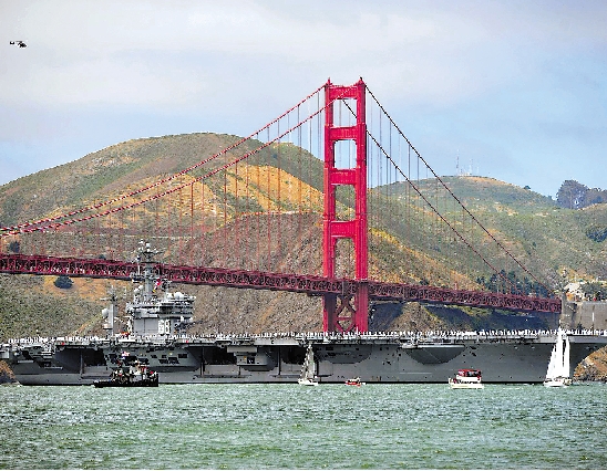 5月27日,在美国旧金山,美国海军“尼米兹”号航母驶入旧金山湾庆祝金门大桥建成通车75周年。旧金山著名标志性建筑金门大桥建成于1937年5月,是贯通美国西海岸大动脉101高速公路的一座跨海桥梁。今年是金门大桥建成75周年,旧金山将为此举行一系列庆祝活动。 新华社发 |