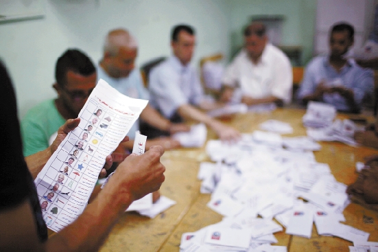 在埃及首都开罗的一处投票站,工作人员在统计选票。 新华社发