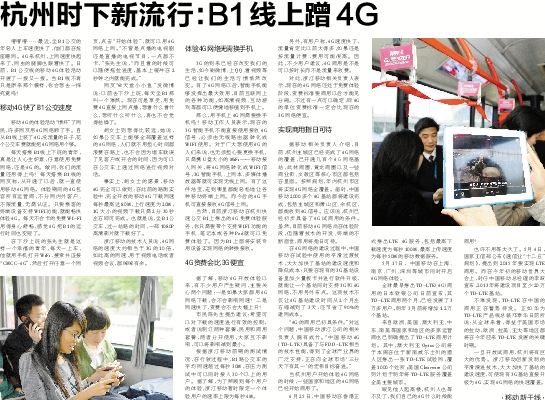 据移动相关负责人介绍,目前,杭州主城区已经完成了4G网络的覆盖,已开通几百个4G网络基站,武林商圈、黄龙商圈以及一些商业街、文教区等核心市区都包括在里面。按照规划,年内杭州市区将实现4G网络全覆盖。届时,中国移动2000多个4G基站都将建设完成,包括主城区和萧山区、余杭区,都能收到4G信号。应该说,杭州已经初步具备了4G试商用的条件。虽然,目前移动4G网络尚在体验阶段,但随着技术的开发、终端的不断面世,商用将指日可待。