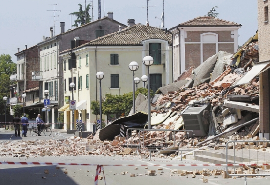5月29日,在意大利摩德纳附近,行人从地震中倒塌的房屋旁经过。 新华社发