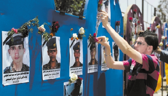 5月29日,一名也门男子在悼念活动中向遇难的士兵照片献花。也门29日在首都萨那举行活动,悼念21日参加阅兵仪式排练时遭“基地”组织自杀式袭击遇难的士兵。 新华社发