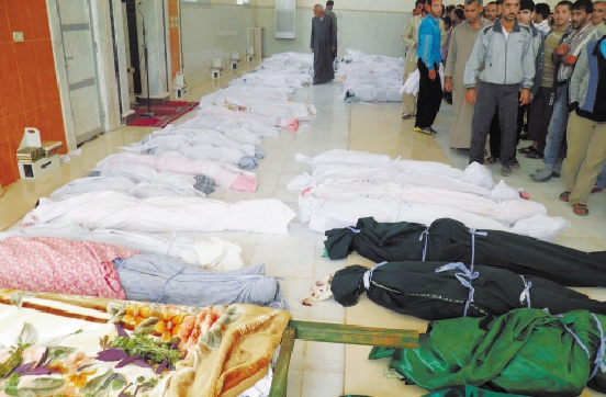 这张叙利亚沙姆电视新闻网公布的照片显示,在叙利亚胡拉镇,袭击事件中遇害者的尸体停放在一家医院的停尸房内,准备下葬。 新华社发