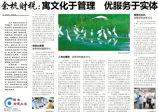 本篇主角——余杭区财政地税局,与时俱进,从营造活力充盈的精神文化和人文氛围到“五型”财税机关创建,从财税文化平台搭建和体系构建到全力支持发展实体经济,一年一大步,踏实前行,在财税管理文化、财税服务文化、财税效率文化等方面作出了创新性的探索。