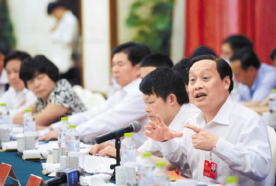 6月6日,在审议省第十三次党代会报告中,代表们畅所欲言。图为宁波代表团的代表李令红(右一)在发言。