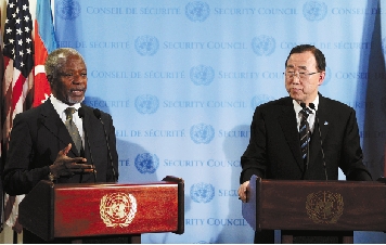 6月7日,联合国安理会就叙利亚局势举行闭门磋商。图为在联合国总部,联合国秘书长潘基文(右)、联合国-阿盟叙利亚危机联合特使安南(左)在磋商结束后出席记者会。 新华社记者 申宏 摄