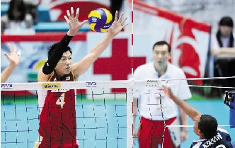 6月9日,在日本东京举行的2012年伦敦奥运会男排落选赛中,中国队以3比1战胜委内瑞拉队。中国队球员张晨(左)在拦网。 新华社发