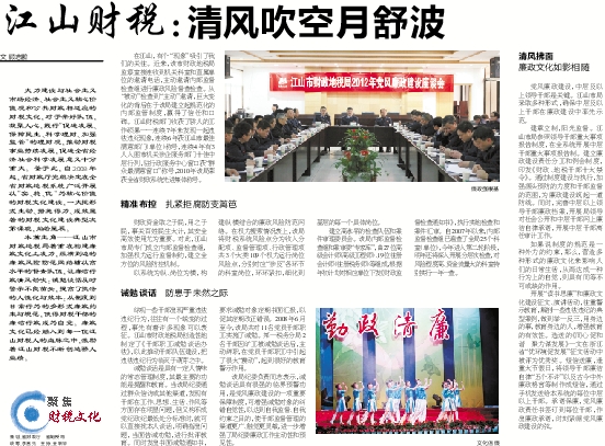 本篇主角——江山市财政地税局着重在构建廉政文化上发力,纵横到边的廉政风险防范网络辅以高水平的督查队伍,让廉洁行政清风劲吹;诫勉谈话及时警示不良苗头,提高了执法的人性化与效率;从制度到日常行为的多形式廉政约束与规范,使得财税干部的廉洁行政成为自觉。廉政文化已经融入到每一位江山财税人的血脉之中,激励着江山财税不断创造骄人业绩。