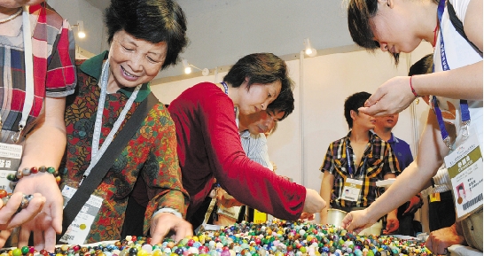 在浙洽会、消博会各场馆洽谈活跃,图为在青田一家公司展位前,消费者在挑选七彩玉石。 记者 吴元峰 摄
