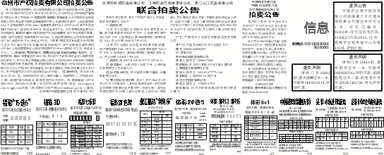 我公司接受法院委托,经工商局备案【台工商(12)前拍字第61号,监督电话:(0576)88517507】,定于2012年6月28日上午10时在台州市房地产管理处3楼会议室公开拍卖:一、拍卖标的、起拍价及保证金:1.台州恒利五金制造有限公司所有坐落于路桥金清镇卷桥村的土地使用权及房产,土地证载国有出让工业用地面积21784.61m2;房屋建筑面积共计23917.43m2(其中未发证面积5260.2m2),起拍价2800万元,保证金200万元。2.仇清清所有坐落于台州市路桥区嘉绿苑5幢601室的房地产及相应储藏室、地下车位和室内家具、电器,房产证载住宅建筑面积130.61m2,土地证载国有出让住宅用地面积20.72m2,起拍价95万元,保证金9万元。3.周影、周应龙共有坐落于台州市椒江区台州大道北段8号10幢209室的房地产,房产证载商业建筑面积42.58m2,土地证载国有出让商业用地面积23.16m2,起拍价43万元,保证金4万元。 二、采用加价竞投的形式,最高应价达到或超过保留价者成交。三、报名时间、地点:有意者应在2012年6月26日下午前将保证金存入路桥法院执行款专户,开户行:浙江泰隆商业银行,账号:6321501201110010089,持缴款凭证到路桥法院开具收据,凭收据和有效证件传真至(0576)88311916或到椒江区白云山中路102号市房管处219室办理报名手续,报名截止到6月27日。未中拍者可在三日内退还保证金(不计息)。四、展示时间: 2012年6月26日~27日。五、与标的相关权利人(案件当事人、担保物权人、优先购买权人等),请届时参加拍卖会,缺席将丧失相关权利。六、联系电话:(0576)88311912 88311916(传真) 82510719(路桥法院)网址:www.tzpm.net www.tzcqpm.com详情:人民法院诉讼资产网(www.rmfysszc.gov.cn)上查询。台州市产权拍卖有限公司 2012年6月13日