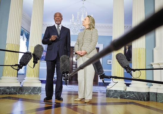 6月8日,在美国首都华盛顿的美国国务院,美国国务卿希拉里·克林顿(右)与到访的联合国—阿盟叙利亚问题联合特使安南在会谈前同记者会面。 新华社记者 张军 摄