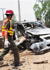 6月12日,在西北部城市白沙瓦,救援人员从遭炸弹袭击的汽车旁走过。