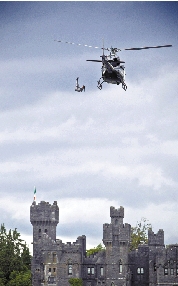 这张照片显示,6月11日,在西部康镇的阿什福德城堡旁,曾九次获得世界冠军的运动员奥兰多·杜克从23米高的直升机上跳下。