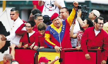 6月11日,委内瑞拉总统查韦斯(中)在首都加拉加斯向支持者致意。 新华社发