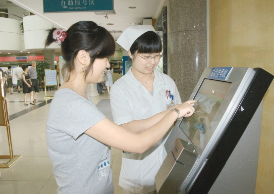 浙江省立同德医院的护士正在指导病人使用自助挂号机。 楼建丽 摄