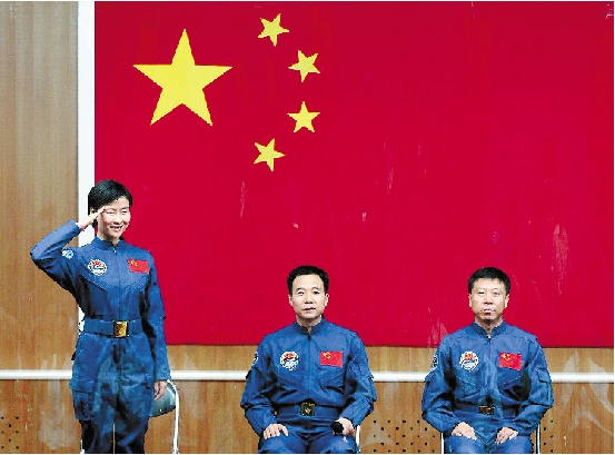 6月15日下午,首次载人交会对接任务航天员景海鹏(中)、刘旺(右)和刘洋与记者见面。 本报特派记者 王颖 摄