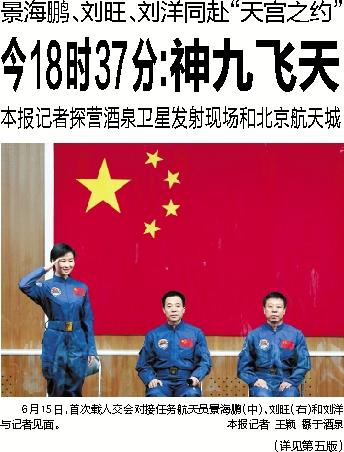 6月15日,首次载人交会对接任务航天员景海鹏(中)、刘旺(右)和刘洋与记者见面。 本报记者 王颖 摄于酒泉