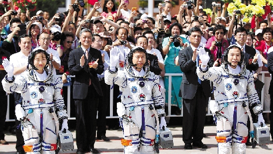 6月16日,神舟九号航天员出征仪式在酒泉卫星发射中心航天员公寓问天阁举行。刘洋、刘旺、景海鹏向群众挥手致意。 本报特派记者