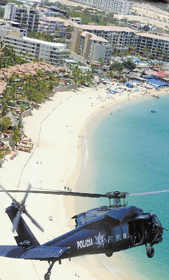 6月15日,墨西哥联邦警察的直升机在洛斯卡沃斯海滩上空巡逻。 视野网供图
