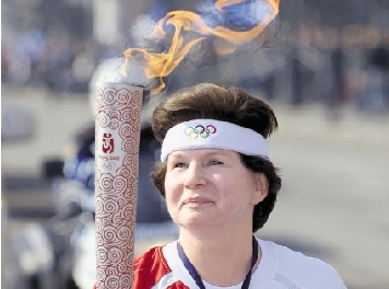 这是2008年4月5日捷列什科娃在俄罗斯圣彼得堡参加北京奥运会火炬传递的资料照片。 新华社发