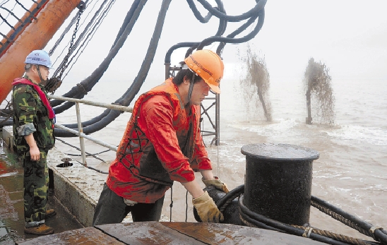 昨日,在舟山灰鳖洋海域,埋管船正在将直径1.2米的舟山大陆引水工程跨海输水管道深埋到海底2米以下。这个工程正以一天500米的速度完成最后4公里的埋管任务,7月中旬将完成登陆贯通。 姚峰 摄