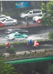 6月17日下午2点多,杭州庆春路菜市桥段马路上的积水深达20多公分,汽车驶来,水花飞溅。 王荣贵 摄