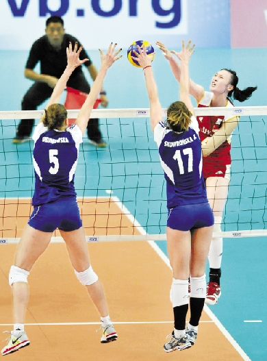 17日,在2012年世界女排大奖赛中国佛山站的比赛中,已经取得奥运资格的中国队以3比0战胜波兰队,从而以三战全胜不失一局的战绩夺得本站比赛的冠军。图为中国队球员惠若琪(右)在比赛中扣球。 新华社发