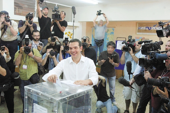 6月17日,左派政党联盟领导人齐普拉斯(中)在希腊雅典投票。 新华社发(马里奥斯·洛洛什 摄)