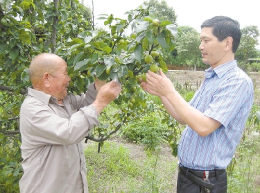 陆光明(右)和老夏(左)在果树林。